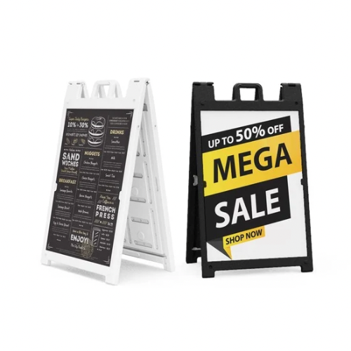Each order includes a sturdy A-frame sign holder and two custom 24×36” coroplast panels printed in full color on one side. Designed for easy setup and portability, these signs are perfect for promoting specials, advertising products or services, or sharing important information.