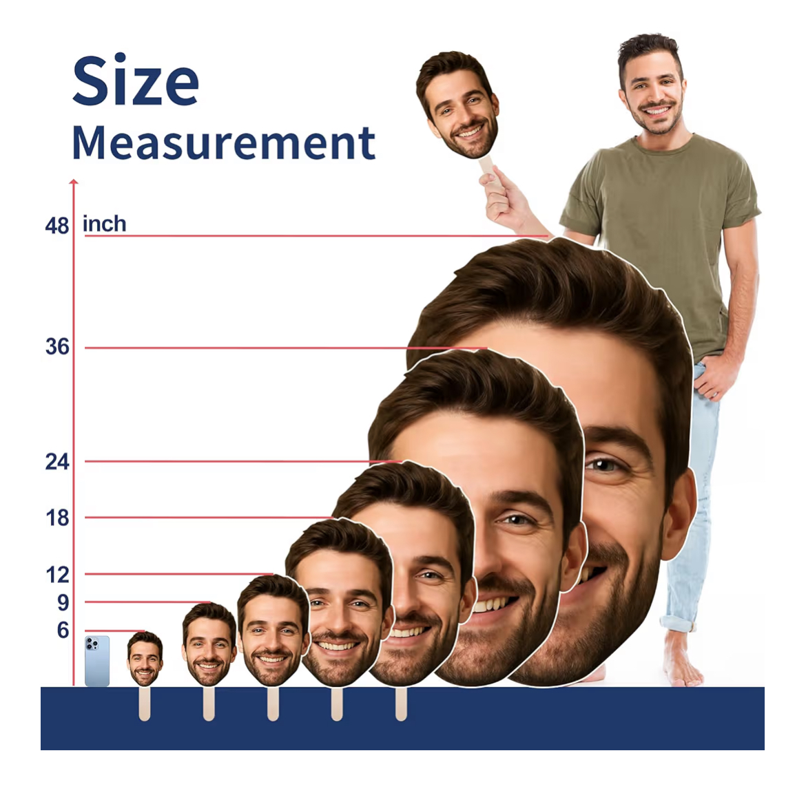 Turn any face into a fun custom big head cutout! Choose sizes from 6” to 48”, made from durable coroplast with vibrant printing. Perfect for parties, graduations, sports events, and gifts. Fast printing from our U.S. factory!